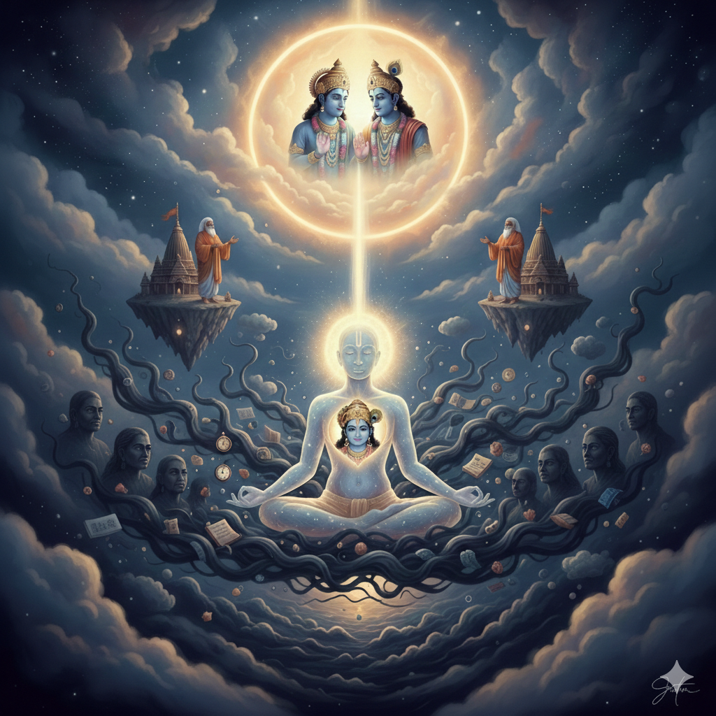 Grace (कृपा, kr̥pā) is the causeless, infinite compassion of the Divine, bestowed without expectation of return. Explore how God and Guru function as the source and medium of this power, lifting the veil of Māyā to enable the soul’s transition from material bondage to eternal, divine Bliss (Ānanda).