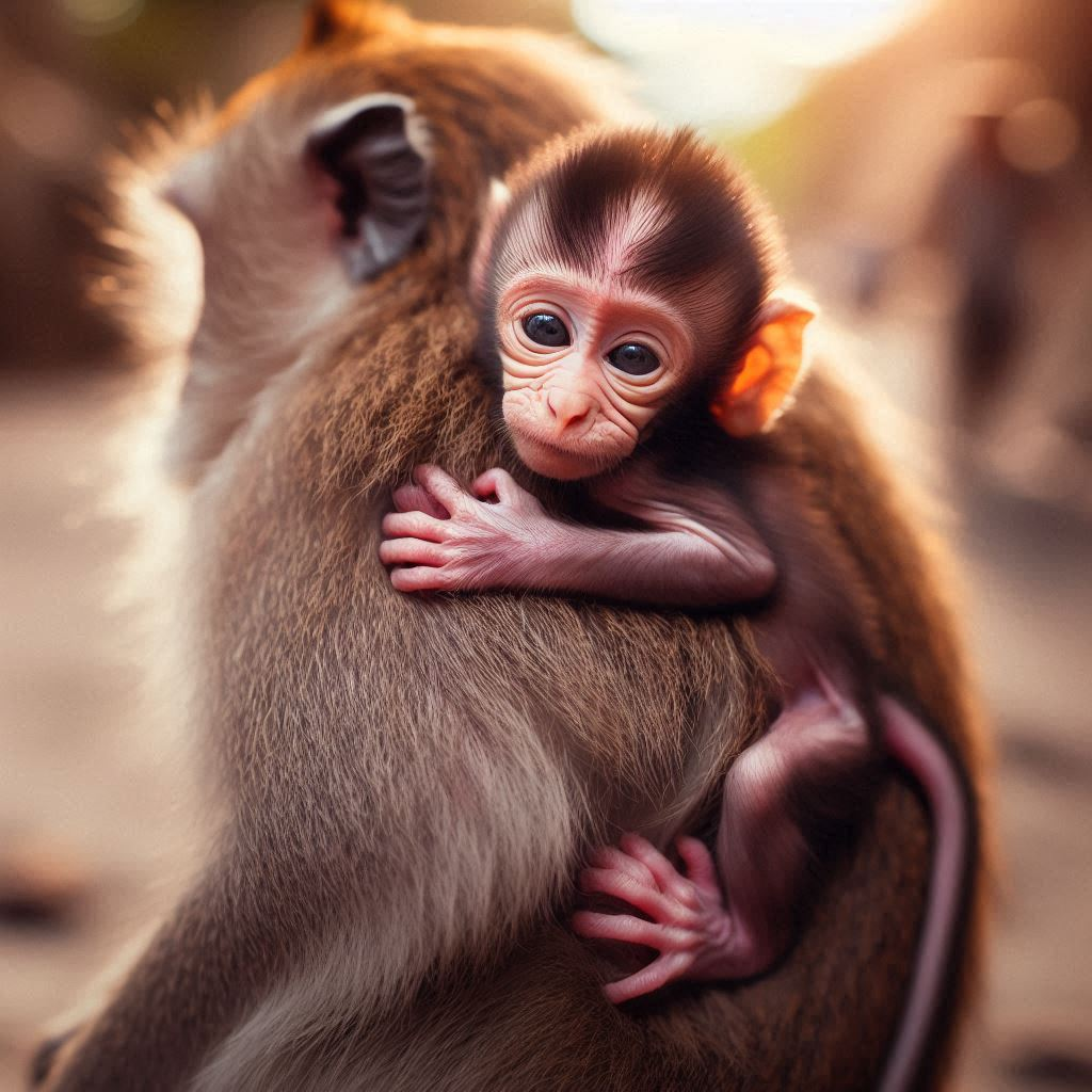 The baby monkey holds its mother. Whereas the cat holds its own kitten.