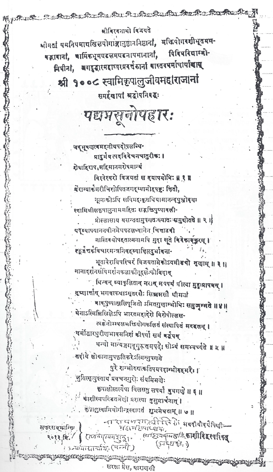The Padya-Prasūnōpahāra is the formal Sanskrit poetic offering presented during the 1957 recognition ceremony in Kashi, at which the title Jagadguruttam was conferred upon Jagadguruttam Swami Shri Kripalu Ji Maharaj.
