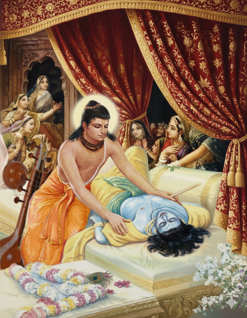 Narad Ji knew that this is a self created pain, so a self medication will be the only remedy. So, Sage Narad asked Shri Krishna, Narada asked Krishna, "What is the only thing that can help you, my Lord?"