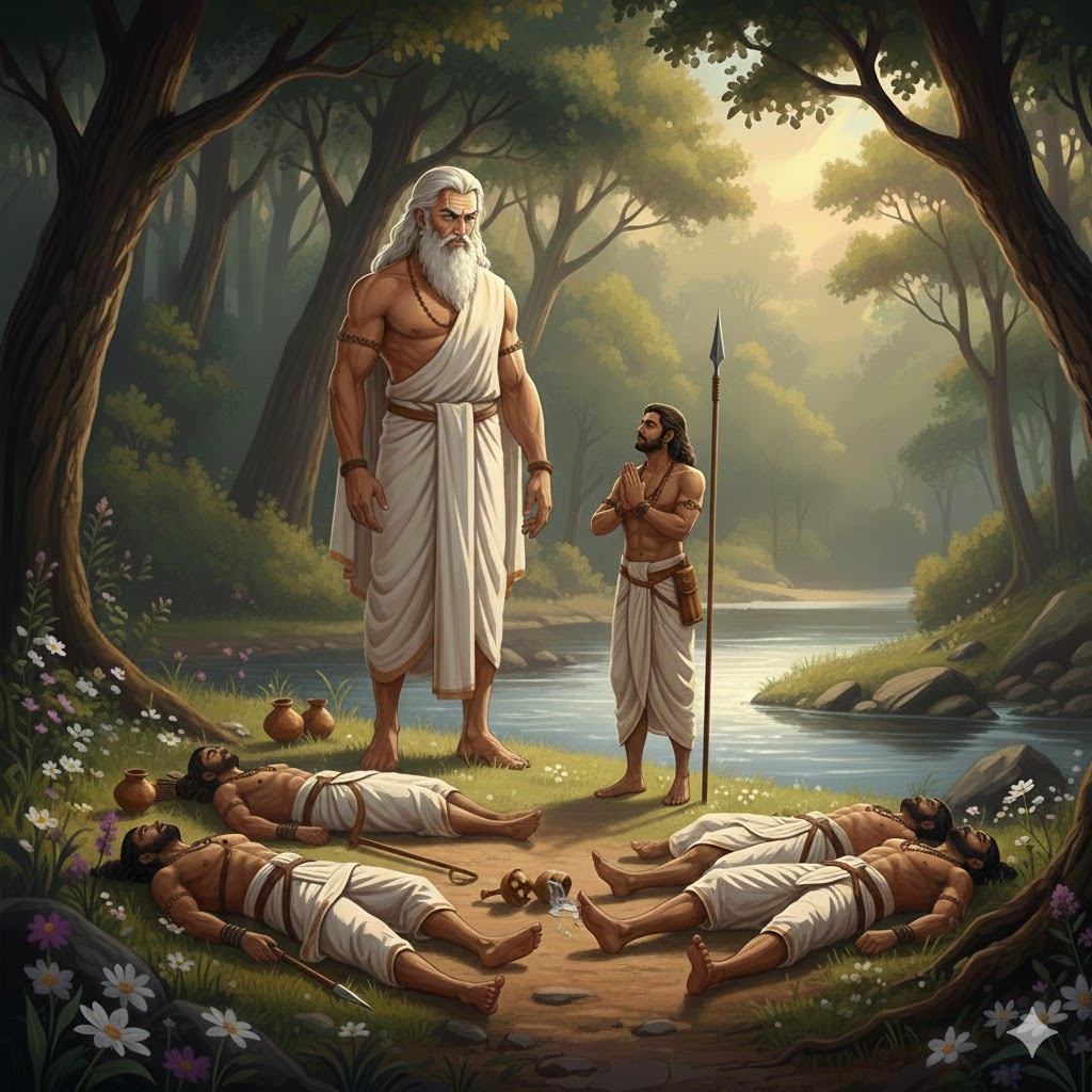 The Dialogue: Wisdom Meets Power Eventually, Yudhishthira went to look for his brothers. He was faced with the devastating sight of his four brothers lying lifeless on the banks. After grieving, he looked around with the sharp eyes of a king: